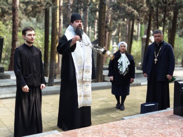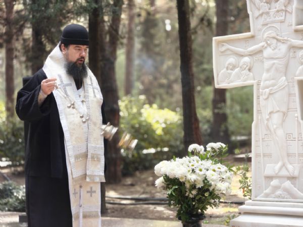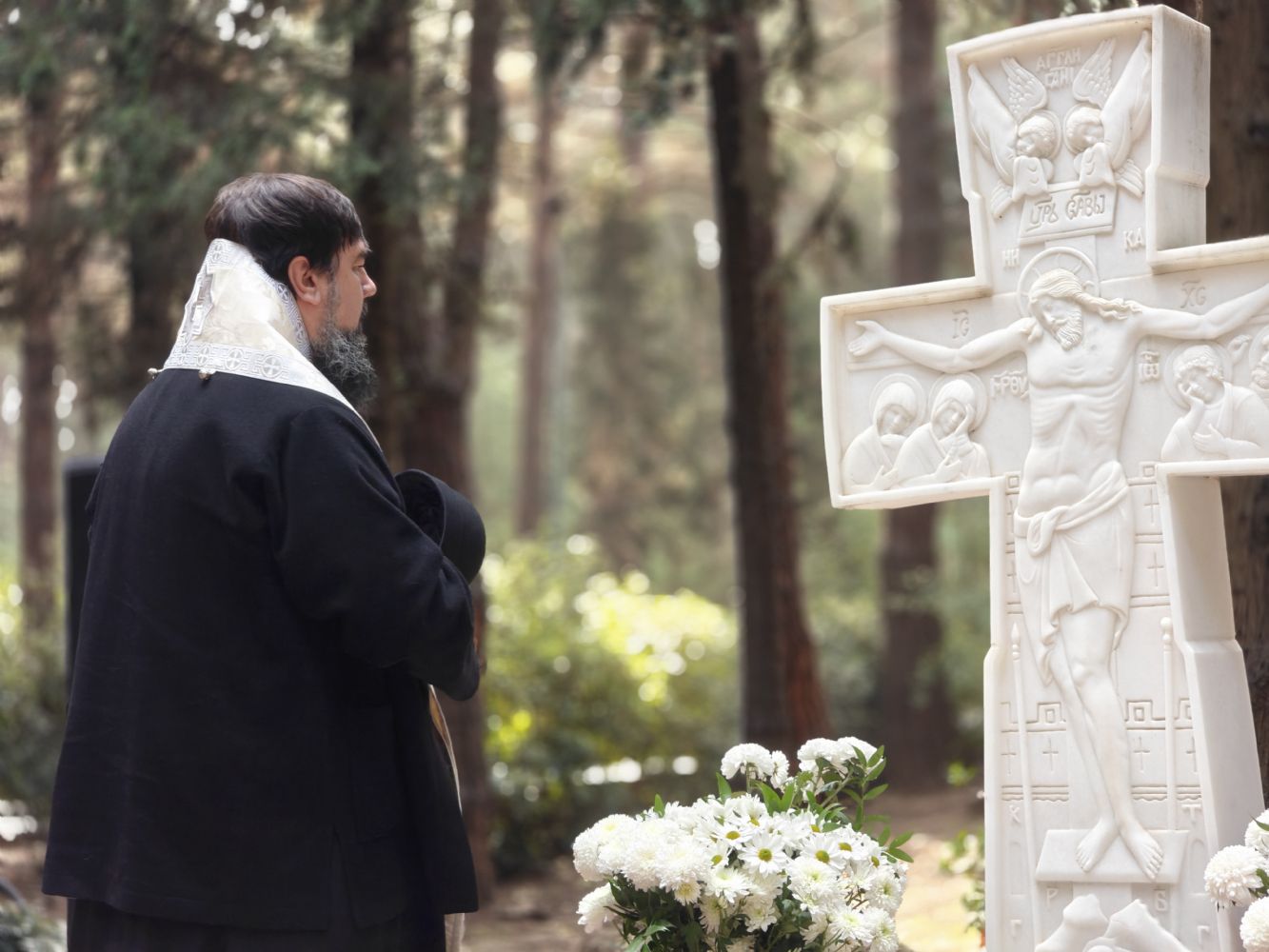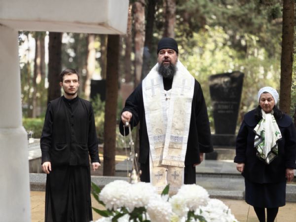 Yepiskop Aleksiy arxiyepiskop Aleksandrın (İşeyin) məzarı başında mərhumlar üçün litiya duasını oxuyub
